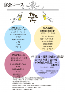 忘年会、新年会予約受付中!お電話にてお問い合わせください。